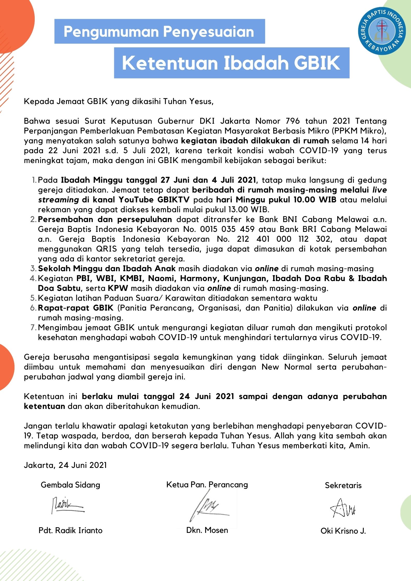 Pengumuman Penyesuaian Ketentuan Ibadah GBIK