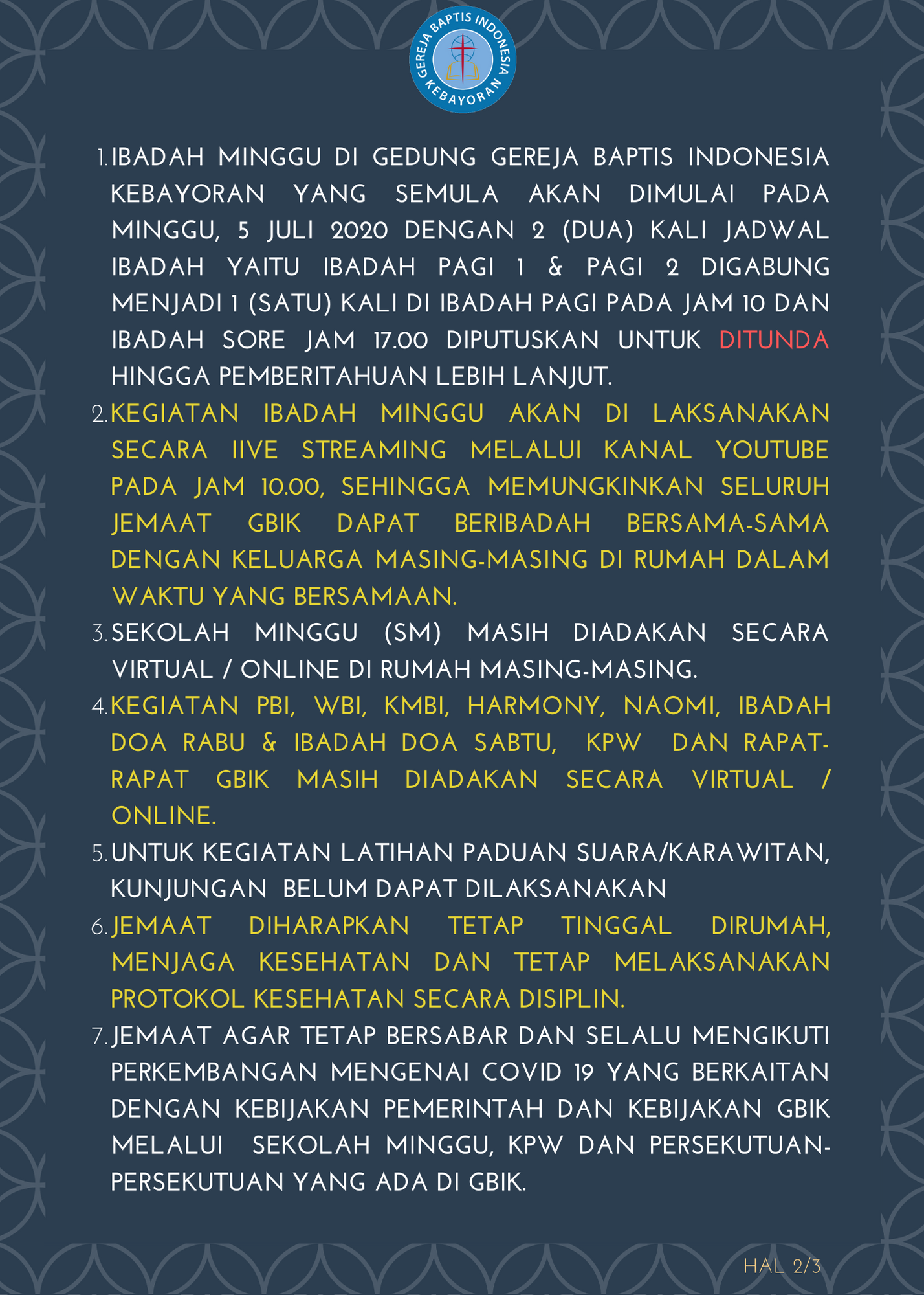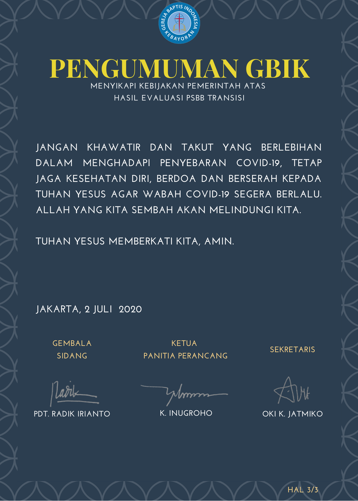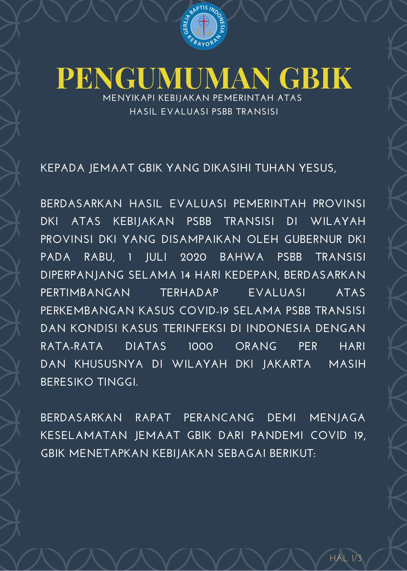Berdasarkan Rapat Perancang demi menjaga keselamatan Jemaat GBIK dari Pandemi Covid 19, GBIK menetapkan kebijakan sebagai berikut: